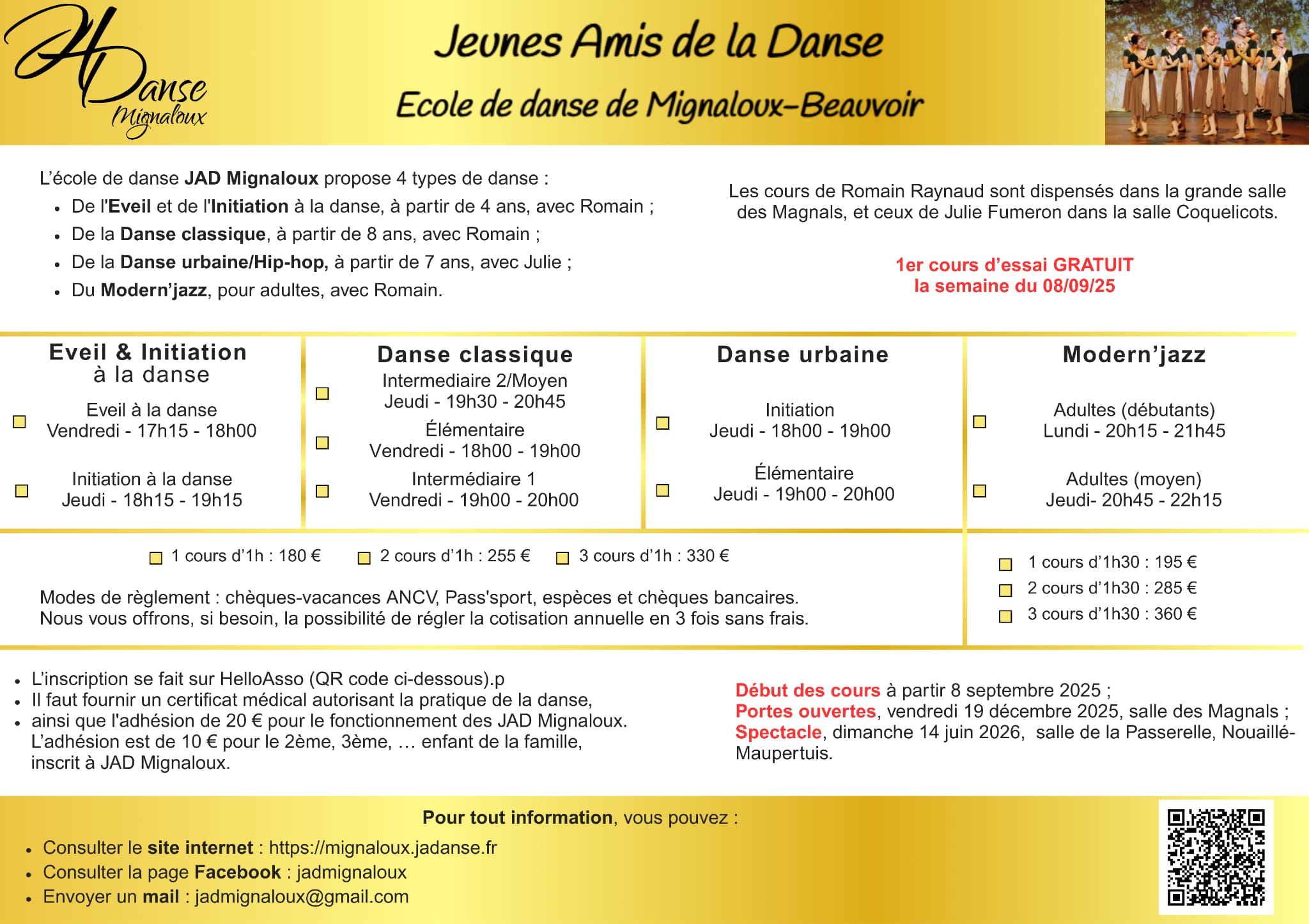 Lieu des cours : studio de danse – Complexe sportif 86340 Les Roches-Prémarie Andillé
